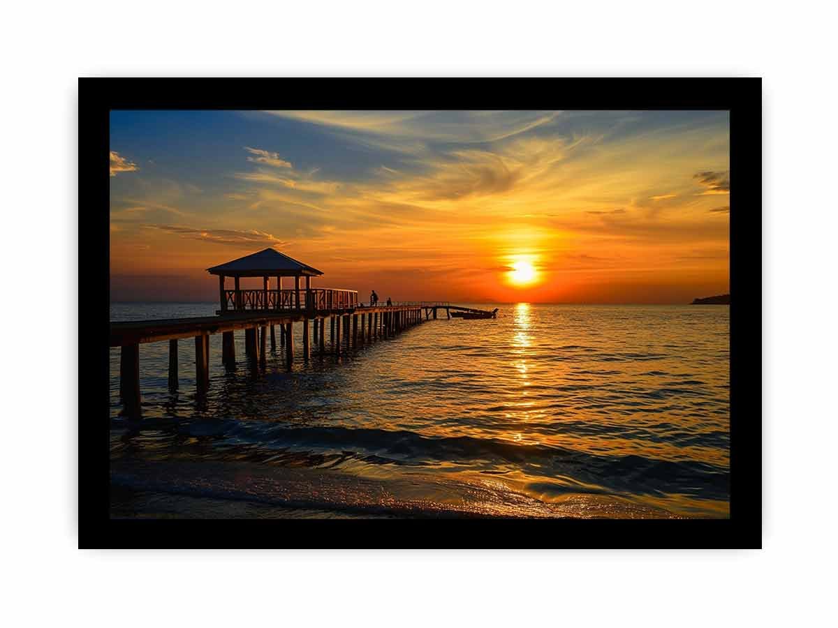 Whether placed in a living room, bedroom, or personal workspace, this sunset pier canvas adds warmth without noise. The color palette leans into soft golds, muted blues, and natural gradients that complement modern, minimalist, and contemporary interiors just as well as cozy, lived-in spaces.